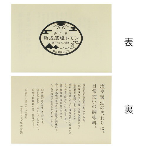 ■名称:塩レモン ■原材料名:レモン皮、レモン果汁、食塩(藻塩) ■内容量:120g×2個 ■賞味期限:製造より1年。