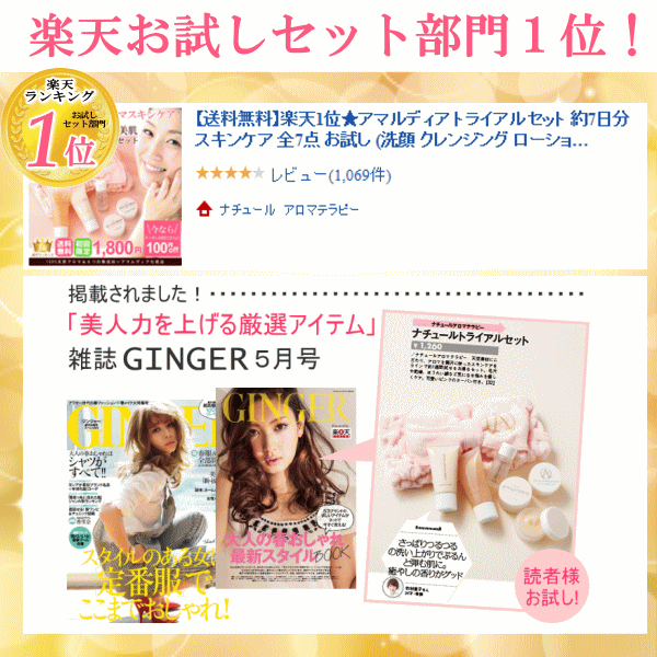 ※海外発送不可 ※プレゼント対応不可 ※ご返品不可 <お支払方法> 楽天ポイント払いもOK! ○クレジットカード ○代金引換(+手数料324円) ○楽天バンク決済(+手数料155円) ○銀行振込(+振込手数料) ○セブンイレブン決済(+手数料250円) ○ペイジー(+手数料250円) 全成分 詳しくはこちら 広告文責 株式会社ナチュールアロマテラピー 03-6427-6515 製造元 株式会社アンプリー 区分 日本製 ・ 化粧品 その他 メーカー希望小売価格はメーカーサイトに基づいて掲載していますお試しセット部門1位!(2014/5/10) (2014/4/26) (2014/4/6) (2014/3/11) (2014/3/9) (2014/2/12) (2014/2/6) (2014/2/5) (2014/2/4) (2014/2/3) (2014/2/2) (2014/2/1) (2014/1/31)・・・)等多数! ●ご愛用者様インタビュー全文こちら● ●アマルディア6つのお約束● ●敏感肌の方はこちらを参照して下さい●