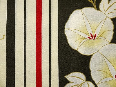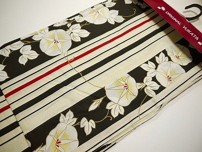 仕立上り 女性用 浴衣 プレタ浴衣 黒と生成りと赤の縞 朝顔 毎年、当店でも大変人気のあるおび工房謹製のお仕立て上がりの浴衣です とてもリーズナブルな価格で出品していますので最高のコスパを保証します。